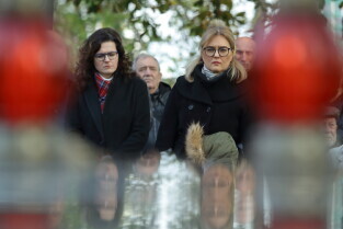 Gdańsk. Cmentarz - Pomnik Nieistniejących Cmentarzy. Modlitwa międzywyznaniowa za tych , którzy żyli i spoczęli na gdańskiej ziemi. Nz. Prezydent Gdańska Aleksandra Dulkiewicz i Magdalena Adamowicz.