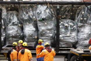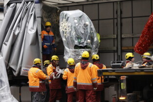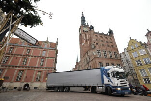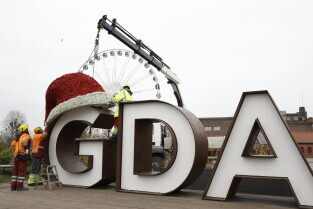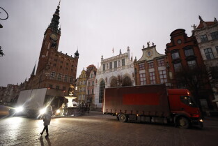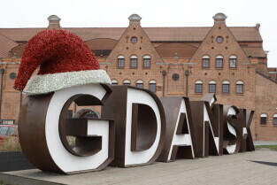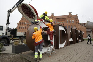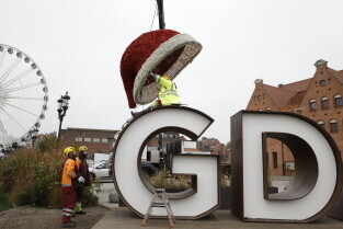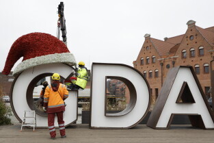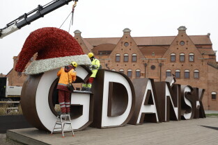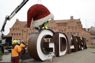 Gdańsk. Montaż choinki na Długim Targu i przystrojenie napisu Gdańsk.