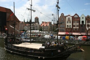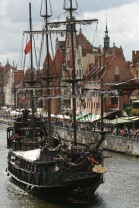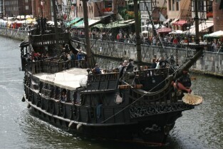 Gdańsk, rzeka Motława. Nz. stylizowany na galeon statek wycieczkowy Czarna Perła