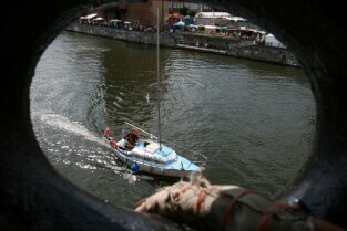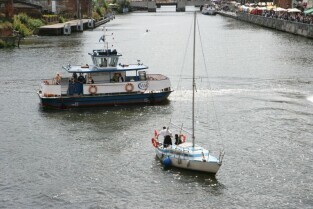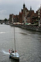 Gdańsk, rzeka Motława. Nz. prom Motława i jacht Delfin