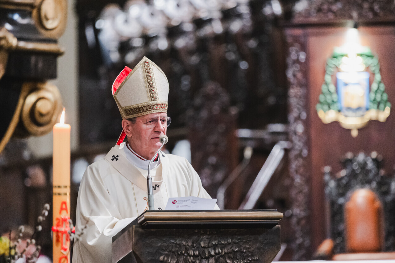 Gdańsk, Katedra Oliwska. Msza św. dziękczynna za zmarłego papieża Franciszka. Nz. Arcybiskup Tadeusz Wojda