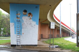 Gdańsk. Na jednym z przęseł estakady nad ul. Siennicką, powstaje grafika dedykowana pracownikom opieki zdrowotnej.