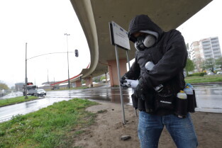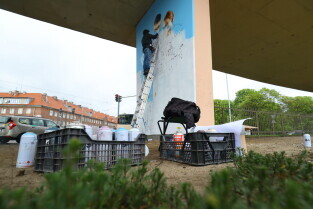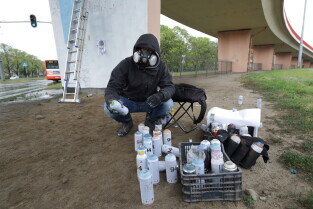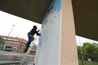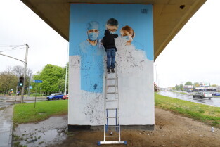 Gdańsk. Na jednym z przęseł estakady nad ul. Siennicką, powstaje grafika dedykowana pracownikom opieki zdrowotnej. Nz. Autor Marek LOONEY Rybowski.