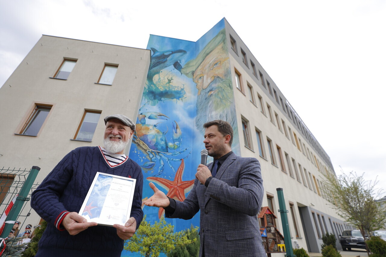 Gdańsk.Mural autorstwa Rafała Roskowińskiego z wizerunkiem słynnego podróżnika, śp. Aleksandra Doby, powstał na ścianie budynku Morskiej Szkoły Podstawowej w Gdańsku.