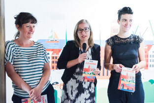Gdańsk. Prezentacja przewodnika i interaktywnej wystawy dla dzieci i rodziców "Odkryj Gdańsk z Niemapą". Nz. Monika Szewczyk-Wittek, Joanna Paniec z Urzędu Miasta, Małgorzata Żmijska - z Mamy Projekt