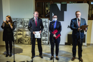 Gdańsk, ul. Stefana Jaracza. NOMUS. Uroczyste otwarcie. Nz. (od lewej) Marszałek Województwa Pomorskiego Mieczysław Struk, Prezydent Gdańska Aleksandra Dulkiewicz i Dr hab. Jacek Friedrich, prof. UG i dyrektor gdańskiego oddziału Muzeum Narodowego