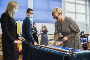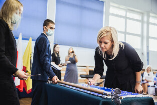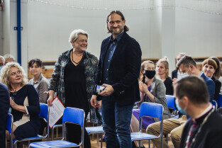 Gdańsk, X Liceum Ogólnokształcące Dwujęzyczne im. Lecha Bądkowskiego w Gdańsku ul. Kościuszki. Nadanie Szkole imienia Lecha Bądkowskiego. Nz. Piotr Grzelak, wiceprezydent Gdańska i dyrektor liceum Anna Meller