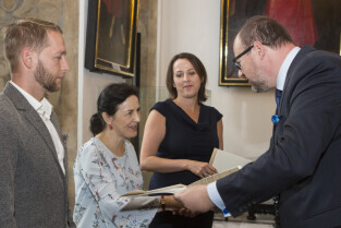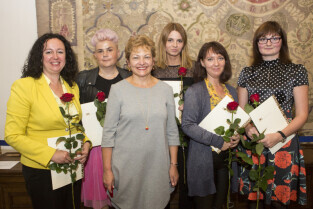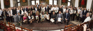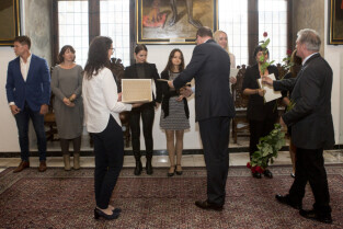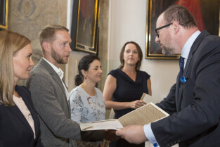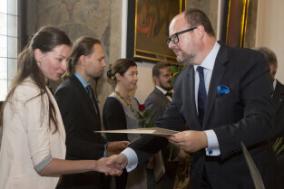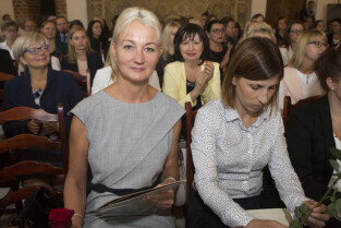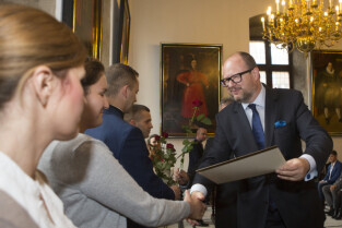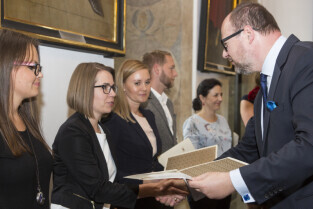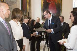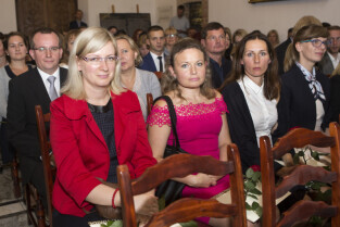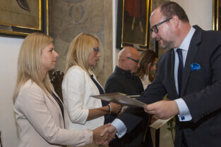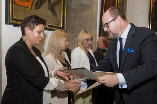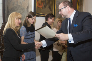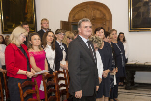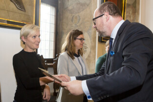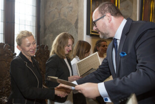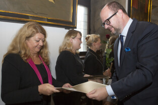 Uroczystość nadania stopnia nauczycielskiego. Akty mianowania wręczyli Prezydent Gdańska Paweł Adamowicz i Przewodniczący Rady Miasta Gdańska Bogdan Oleszek. Gdańsk, Sala Wety Ratusza Głównego Miasta