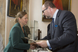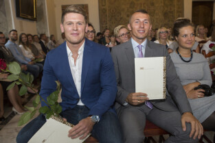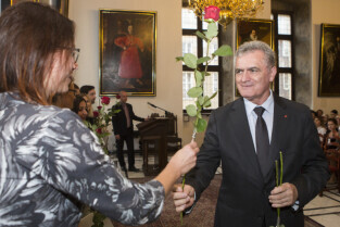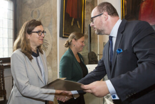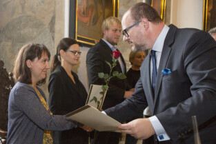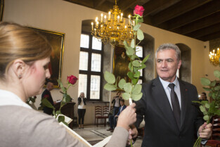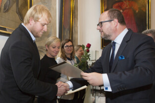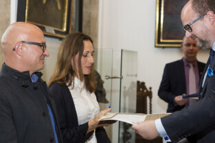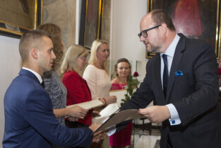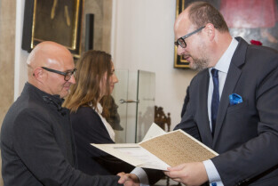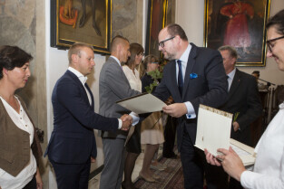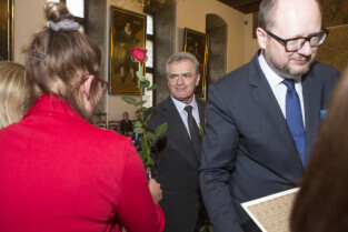 Uroczystość nadania stopnia nauczycielskiego. Akty mianowania wręczyli Prezydent Gdańska Paweł Adamowicz i Przewodniczący Rady Miasta Gdańska Bogdan Oleszek (na zdjęciu). Gdańsk, Sala Wety Ratusza Głównego Miasta