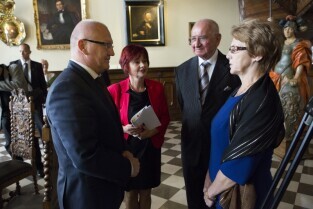 Gdańsk, Dwór Artusa. VII edycja Nagrody Lecha Wałęsy, której laureatem został ukraiński ruch społeczny Euromajdan. Nz. od lewej: Z-ca Prezydenta Gdańska Wiesław Bielawski i Dyrektor Kancelarii Prezydenta Gdańska Helena Chmielowiec, po prawej Danuta Wałęsa