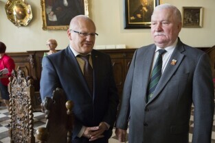 Gdańsk, Dwór Artusa. VII edycja Nagrody Lecha Wałęsy, której laureatem został ukraiński ruch społeczny Euromajdan. Nz. Z-ca Prezydenta Gdańska Wiesław Bielawski i Lech Wałęsa