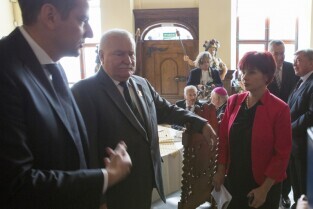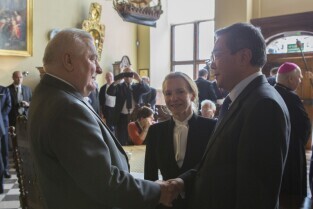 Gdańsk, Dwór Artusa. VII edycja Nagrody Lecha Wałęsy, której laureatem został ukraiński ruch społeczny Euromajdan. Nz. Lech Wałęsa, po lewej Minister Kultury Ukrainy Jewhen Nyszczuk