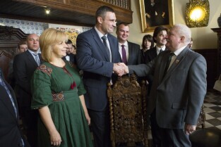 Gdańsk, Dwór Artusa. VII edycja Nagrody Lecha Wałęsy, której laureatem został ukraiński ruch społeczny Euromajdan. Nz. od lewej: Lech Wałęsa, mer Kijowa Witalij Kłyczko, były Prezydent Rumunii Emil Constantinescu