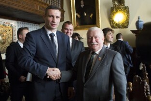 Gdańsk, Dwór Artusa. VII edycja Nagrody Lecha Wałęsy, której laureatem został ukraiński ruch społeczny Euromajdan. Nz. mer Kijowa Witalij Kłyczko i Lech Wałęsa