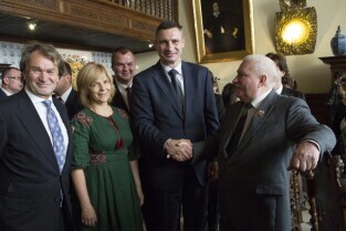Gdańsk, Dwór Artusa. VII edycja Nagrody Lecha Wałęsy, której laureatem został ukraiński ruch społeczny Euromajdan. Nz. mer Kijowa Witalij Kłyczko, Lech i Danuta Wałęsa