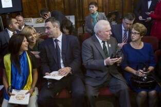 Gdańsk, Dwór Artusa. VII edycja Nagrody Lecha Wałęsy, której laureatem został ukraiński ruch społeczny Euromajdan. Nz. doradczyni prezydenta Poroszenki Olha Bohomołeć, Minister Sportu i Młodzieży Ukrainy Dmytro Bułatow, piosenkarka Rusłana Łyżyczko, Tetiana Czornowoł, mer Kijowa Witalij Kłyczko