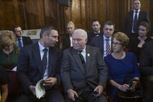 Gdańsk, Dwór Artusa. VII edycja Nagrody Lecha Wałęsy, której laureatem został ukraiński ruch społeczny Euromajdan. Nz. doradczyni prezydenta Poroszenki Olha Bohomołeć, mer Kijowa Witalij Kłyczko i Lech Wałęsa
