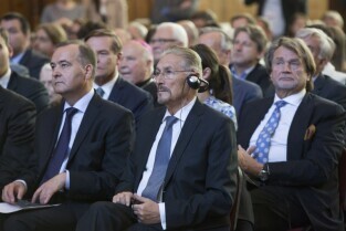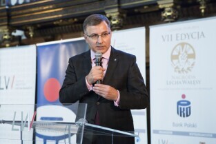 Gdańsk, Dwór Artusa. VII edycja Nagrody Lecha Wałęsy, której laureatem został ukraiński ruch społeczny Euromajdan. Nz. Prezes Zarządu PKO Banku Polskiego Zbigniew Jagiełło