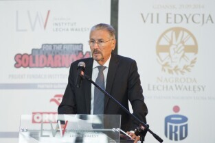 Gdańsk, Dwór Artusa. VII edycja Nagrody Lecha Wałęsy, której laureatem został ukraiński ruch społeczny Euromajdan. Nz. Lech Wałęsa