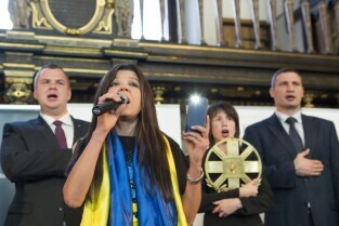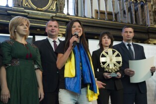 Gdańsk, Dwór Artusa. VII edycja Nagrody Lecha Wałęsy, której laureatem został ukraiński ruch społeczny Euromajdan. Nz. ukraińska piosenkarka Rusłana Łyżyczko