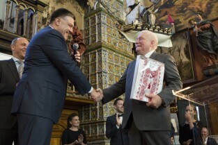 Gdańsk, Dwór Artusa. VII edycja Nagrody Lecha Wałęsy, której laureatem został ukraiński ruch społeczny Euromajdan. Nz. Minister Kultury Ukrainy Jewhen Nyszczuk