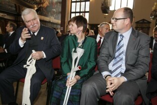 Uroczystość przyznania Nagrody Lecha Wałęsy, którą otrzymała Janina Ochojska - działaczka humanitarna, założycielka i szefowa Polskiej Akcji Humanitarnej. Nz. od lewej: Lech Wałęsa, Janina Ochojska, Paweł Adamowicz
