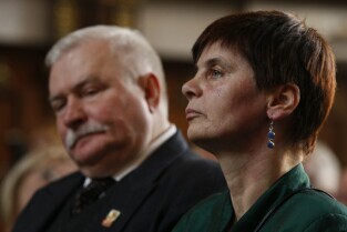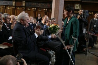 Uroczystość przyznania Nagrody Lecha Wałęsy, którą otrzymała Janina Ochojska - działaczka humanitarna, założycielka i szefowa Polskiej Akcji Humanitarnej. Nz. o. Maciej Zięba, Janina Ochojska i Lech Wałęsa