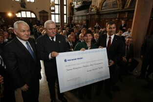 Uroczystość przyznania Nagrody Lecha Wałęsy, którą otrzymała Janina Ochojska - działaczka humanitarna, założycielka i szefowa Polskiej Akcji Humanitarnej. Nz. od lewej: Lech Wałęsa, Janina Ochojska, Zbigniew Jagiełło (Prezes PKO BP)