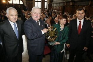 Uroczystość przyznania Nagrody Lecha Wałęsy, którą otrzymała Janina Ochojska - działaczka humanitarna, założycielka i szefowa Polskiej Akcji Humanitarnej. Nz. od lewej: Lech Wałęsa, Janina Ochojska, Paweł Adamowicz, Michał Owczarczak, Bogdan Oleszek