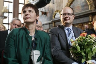 Uroczystość przyznania Nagrody Lecha Wałęsy, którą otrzymała Janina Ochojska - działaczka humanitarna, założycielka i szefowa Polskiej Akcji Humanitarnej. Nz. Janina Ochojska i Prez. Gdańska Paweł Adamowicz