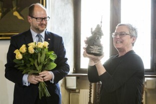Gdańsk, Ratusz Głównego Miasta. Nagroda Naukowa Miasta Gdańska im. Jana Heweliusza za 2015 r. Nz. laureatka w kategorii nauk humanistycznych i społecznych prof. Danuta Popinigis (Akademia Muzyczna w Gdańsku), nagrodę wręcza Prezydent Gdańska Paweł Adamowicz