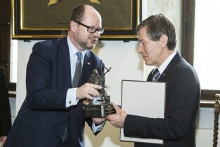 Gdańsk, Ratusz Głównego Miasta. Nagroda Naukowa Miasta Gdańska im. Jana Heweliusza za 2015 r. Nz. laureat w kategorii nauk przyrodniczych i ścisłych prof. Marek Żukowski (Uniwersytet Gdański), nagrodę wręcza Prezydent Gdańska Paweł Adamowicz