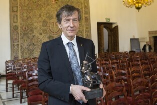 Gdańsk, Ratusz Głównego Miasta. Nagroda Naukowa Miasta Gdańska im. Jana Heweliusza za 2015 r. Nz. laureat w kategorii nauk przyrodniczych i ścisłych prof. Marek Żukowski (Uniwersytet Gdański)