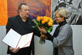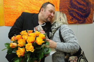 Gdańsk. Wernisaż i wręczenie Nagrody Prezydenta Miasta Gdańska w Dziedzinie Kultury Dariuszowi Syrkowskiemu. Nz. Dariusz Syrkowski i Pamela Granatowski-Referat ds. Mecenatu Kultury.