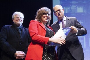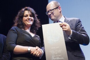 Gala Nagrody Miasta Gdańska dla Młodych Twórców w Dziedzinie Kultury. Gdańsk, Klub Żak. Nz. laureatka Karolina Sikora, nagrodę wręcza Prezydent Gdańska Paweł Adamowicz