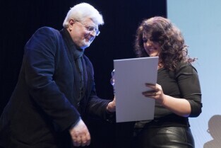 Gala Nagrody Miasta Gdańska dla Młodych Twórców w Dziedzinie Kultury. Gdańsk, Klub Żak. Nz. laureatka Karolina Sikora, nagrodę wręcza Przewodniczący Kapituły Marek Bumblis