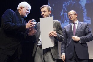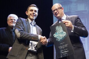 Gala Nagrody Miasta Gdańska dla Młodych Twórców w Dziedzinie Kultury. Gdańsk, Klub Żak. Nz. laureat Jacek Ryń, nagrodę wręcza Prezydent Gdańska Paweł Adamowicz