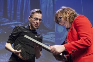 Gala Nagrody Miasta Gdańska dla Młodych Twórców w Dziedzinie Kultury. Gdańsk, Klub Żak. Nz. laureatka plebiscytu publiczności Gazety Wyborczej Trójmiasto Elżbieta Benkowska, nagrodę wręcza Przemysław Gulda (Gazeta Wyborcza Trójmiasto)