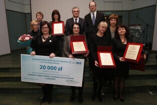 Gala XII edycji Nagrody Prezydenta Miasta Gdańska im. Lecha Bądkowskiego. Gdańsk, Filharmonia Bałtycka. Nz. nagrodę główną otrzymuje Stowarzyszenie Pomocy Osobom Autystycznym, prowadzone przez Małgorzatę Rybicką