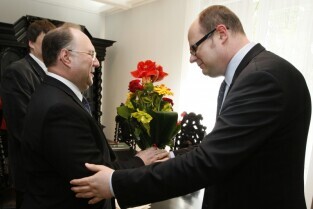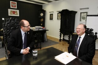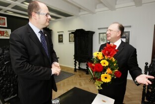 Prezydent Gdańska Paweł Adamowicz wręczył nagrodę w dziedzinie kultury profesorowi Mariuszowi Gizowskiemu. Gdańsk, Urząd Miejski