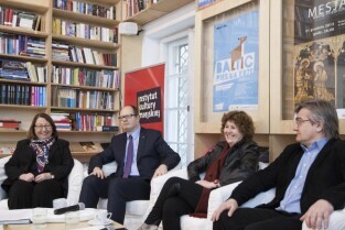 Konferencja prasowa poświęcona ustanowieniu Nagrody Prezydenta Miasta Gdańska za Twórczość Translatorską im. Tadeusza Boya Żeleńskiego. Gdańsk, Instytut Kultury Miejskiej. Nz. od lewej: Dyrektor Biura Prezydenta Gdańska ds. Kultury Anna Czekanowicz-Drążewska, Prezydent Gdańska Paweł Adamowicz, Członkini Kapituły Konkursu Anna Wasilewska, Członek Kapituły Konkursu Stanisław Rosiek