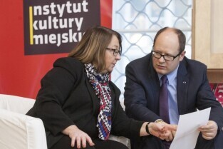 Konferencja prasowa poświęcona ustanowieniu Nagrody Prezydenta Miasta Gdańska za Twórczość Translatorską im. Tadeusza Boya Żeleńskiego. Gdańsk, Instytut Kultury Miejskiej. Nz. Dyrektor Biura Prezydenta Gdańska ds. Kultury Anna Czekanowicz-Drążewska i Prezydent Gdańska Paweł Adamowicz