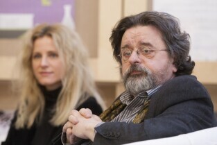 Konferencja prasowa poświęcona ustanowieniu Nagrody Prezydenta Miasta Gdańska za Twórczość Translatorską im. Tadeusza Boya Żeleńskiego. Gdańsk, Instytut Kultury Miejskiej. Nz. Członkowie Kapituły Konkursu Anna Wasilewska i Stanisław Rosiek