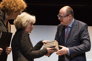 Gdański Teatr Szekspirowski. Gdańskie Spotkania Tłumaczy Literatury "Odnalezione w tłumaczeniu". Uroczystość wręczenia Nagrody za Twórczość Translatorską im. Tadeusza Boya-Żeleńskiego. Nz. laureatka Maryna Ochab, nagrodę wręcza Prezydent Gdańska Paweł Adamowicz