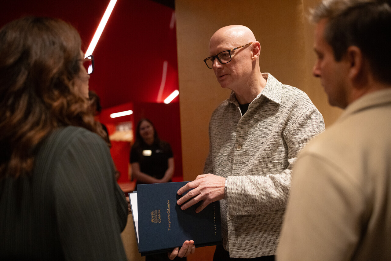 Gdańsk, Teatr Wybrzeże. Rozdanie nagród Prezydent Miasta Gdańska Aleksandry Dulkiewicz w dziedzinie kultury artystom Teatru Wybrzeże przed spektaklem "Potop".