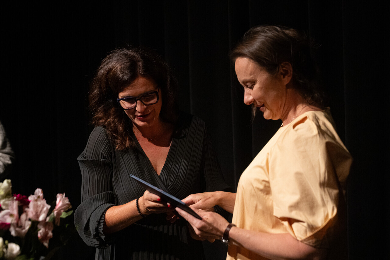 Gdańsk, Teatr Wybrzeże. Rozdanie nagród Prezydent Miasta Gdańska Aleksandry Dulkiewicz w dziedzinie kultury artystom Teatru Wybrzeże przed spektaklem "Potop".