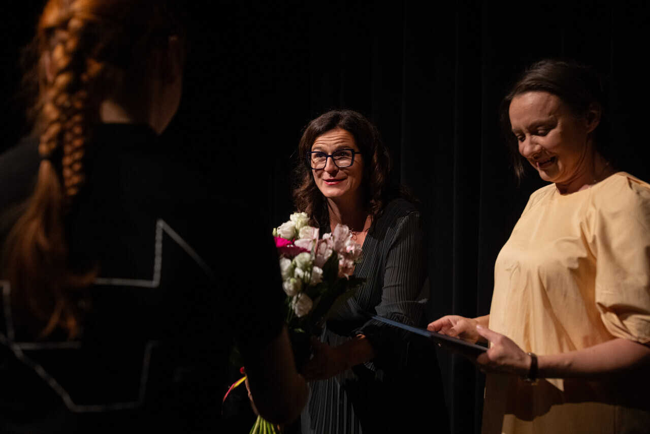 Gdańsk, Teatr Wybrzeże. Rozdanie nagród Prezydent Miasta Gdańska Aleksandry Dulkiewicz w dziedzinie kultury artystom Teatru Wybrzeże przed spektaklem "Potop".