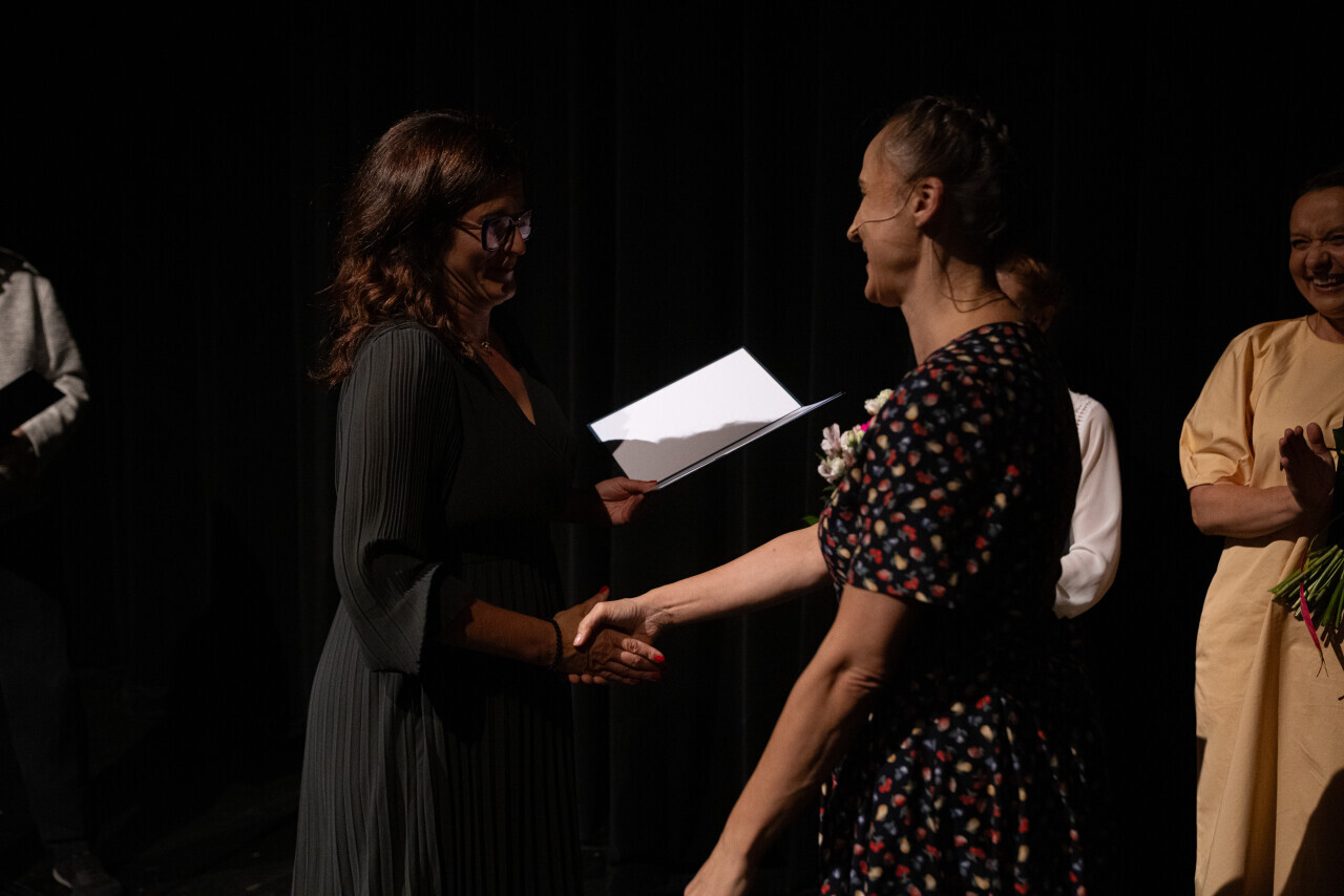 Gdańsk, Teatr Wybrzeże. Rozdanie nagród Prezydent Miasta Gdańska Aleksandry Dulkiewicz w dziedzinie kultury artystom Teatru Wybrzeże przed spektaklem "Potop".