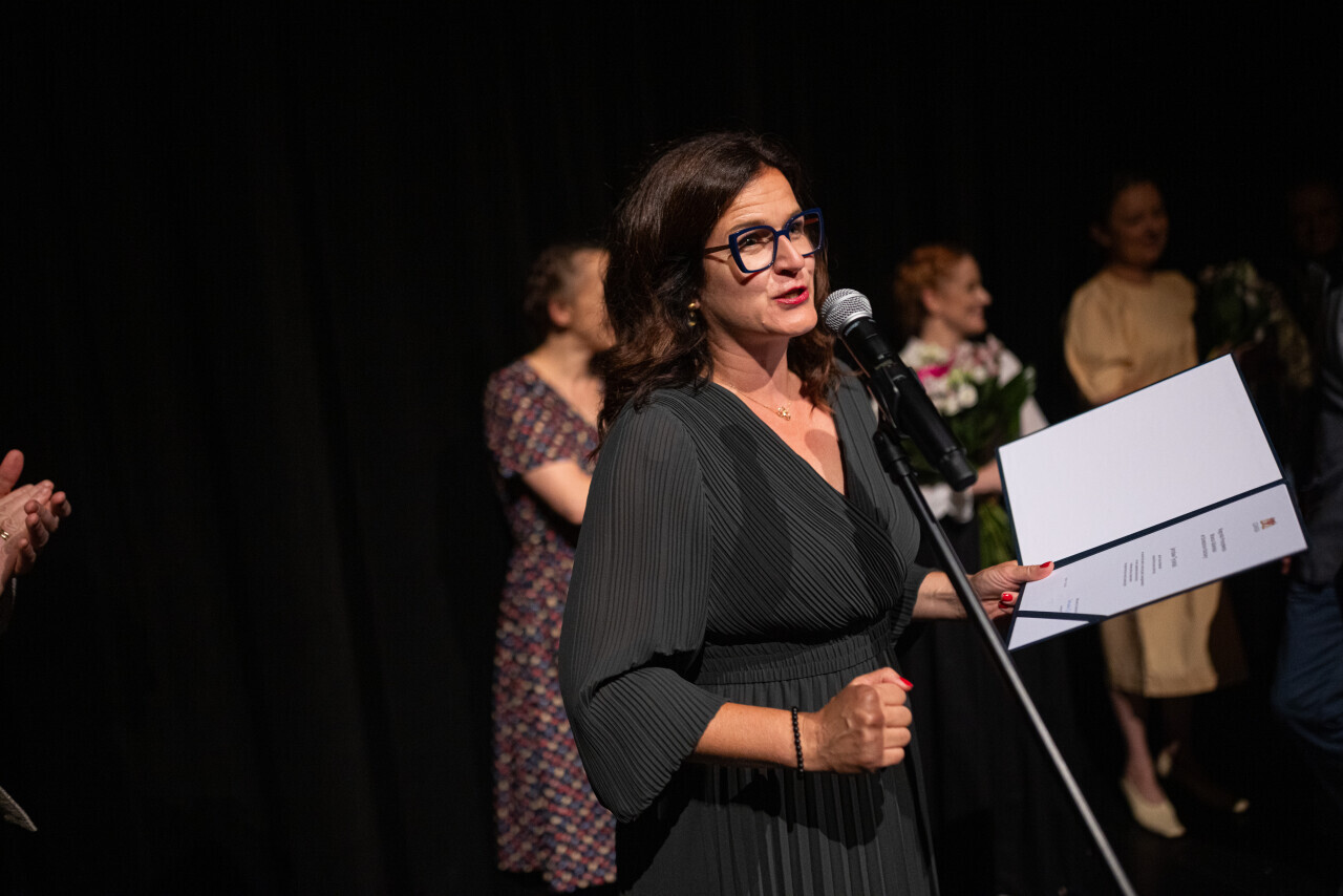 Gdańsk, Teatr Wybrzeże. Rozdanie nagród Prezydent Miasta Gdańska Aleksandry Dulkiewicz w dziedzinie kultury artystom Teatru Wybrzeże przed spektaklem "Potop".