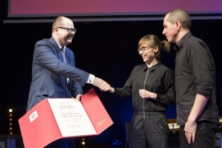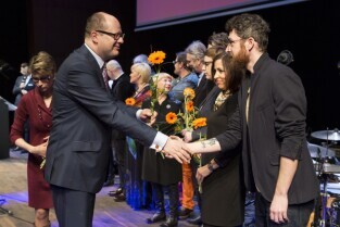 Gala Nagrody Miasta Gdańska w Dziedzinie Kultury "Splendor Gedanensis". Gdańsk, Europejskie Centrum Solidarności. Nz. Anna i Adam Witkowscy, nagrodę wręcza Prezydent Gdańska Paweł Adamowicz
